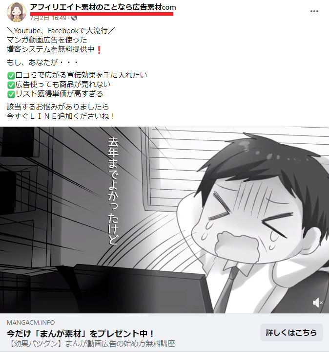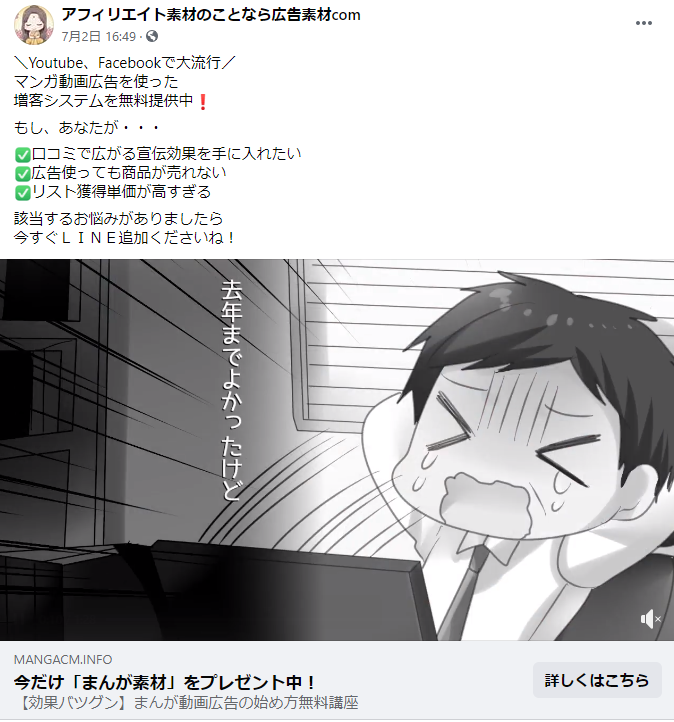 なぜ、私が安価コンバージョンが獲得できるかといえば、今回で云えば「動画広告(まんが)」でサービスの内容を魅力的に伝えているからです。