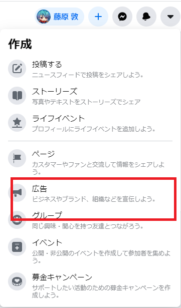 Facebook上部メニュー「広告の掲載」より管理画面へログインしてください。
