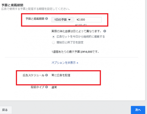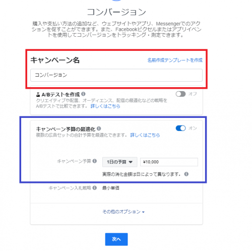 赤囲みはキャンペーンですから、解り易い名前を設定、青囲みは1日の予算となりますので、あなたがFacebookで使える広告の日割り予算を入力し、次へ