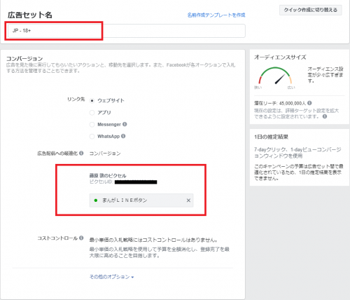 オーディエンスを絞り込みすぎますと、円満に広告配信がされません。ターゲットを絞り込む場合でも配信キャパが15万人~30万人程度を目安にしてください。
