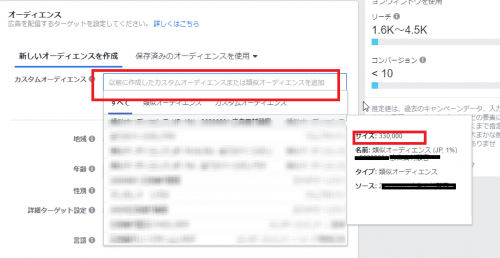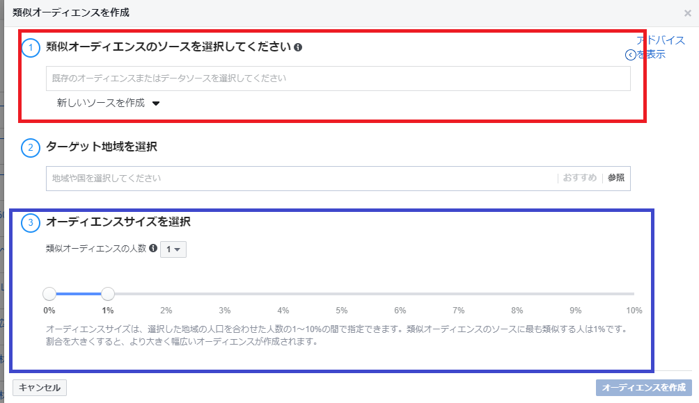 下部青の囲みでオーディエンスのサイズを指定するのですが、サイズが小さい程「属性近い」ものとなりますので、当初は1、又は2で作成し、予算と獲得ボリュームに合わせて3~5まで拡大してみてください。