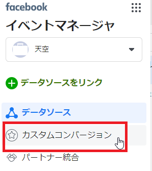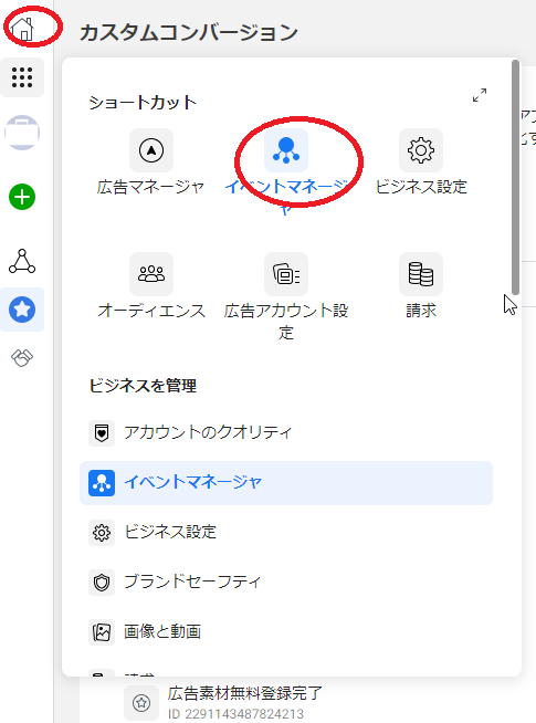 ピクセルの取得方法は、Facebook広告の管理画面右上部メニュー「イベントマネージャー」→「カスタムコンバージョン」を選択。