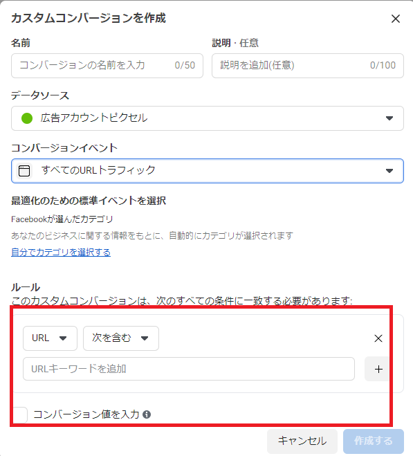 コンバージョンページを指定する際(マイクロコンバージョンや個別サイトごとの測定をしたい際)は、上記囲みに指定URLを設定して作成をクリック。