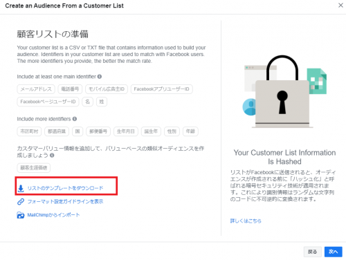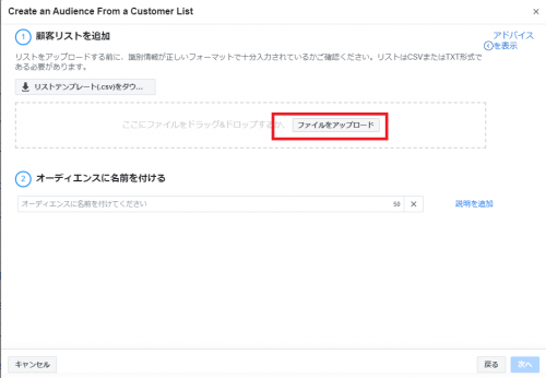 前記してますように、あなたが「優良顧客」(購入、来店者)などの情報(メールアドレス、電話番号、スマホの識別番号)などが1000件以上ある場合は、ここで顧客データーをアップロードしてください。