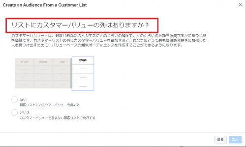 次の画面にカスタマーバリューとありますが、これは顧客の購入額を指しますので、顧客のトータル金額などが解る場合は「含める」を選択して次へ