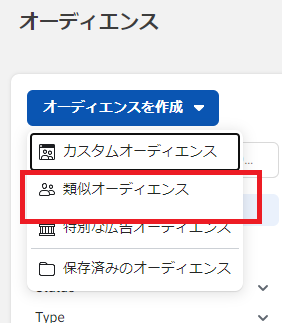 種類が多いので、ここでは前記でアップロードした顧客と属性が近い「類似オーディエンス」の設定方法をご紹介します。