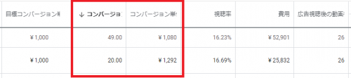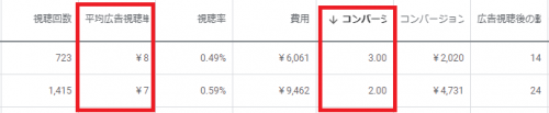 このように別動画からでもコンバージョン獲得することができ、またTrueViewディスカバリー広告で安価に再生数を獲得することで