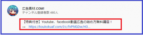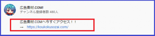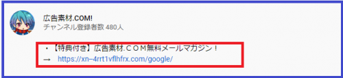 で、私のチャンネルに公開されている動画では、全てにリスト獲得向けLP、若しくは広告素材.COMへリンクするURLを掲載しているので