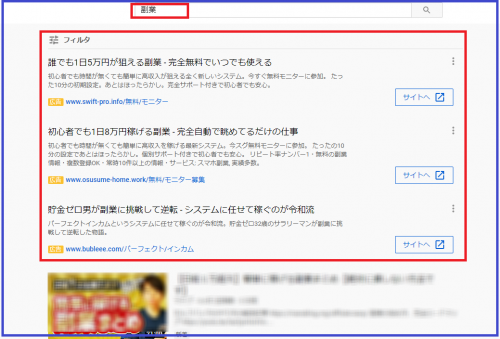 しかし、近頃、Youtube広告の仕様が変わり、検索一覧個所にはGoogle検索広告(クリック保証型広告)が多く表示されるようになってディスカバリー広告があまり表示ることがなくなりました。