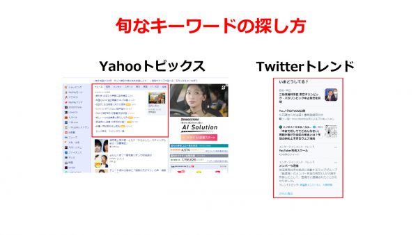旬なキーワードとはYahooトピックスやツイッターで話題となっているキーワードですから、これはマメにYahooやツイッターをチェックしていれば誰でもキーワードの収集は出来ます。