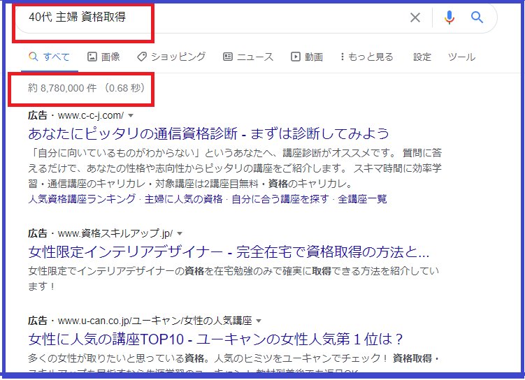 一覧に表示されている「40代 主婦 資格取得」というキーワードをクリックしますと、Googleの同一キーワード検索画面にリンクしますのでキーワードのボリュームを調べます。