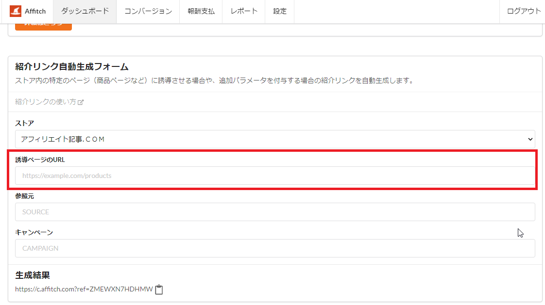 2.管理画面の紹介リンク自動生成フォーム項目にあります「誘導ページのURL」へ(1)で取得したURLを入力します。