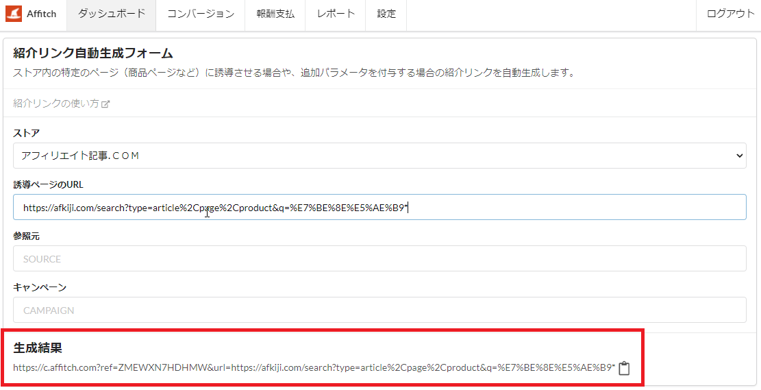 上記囲みの「生成結果」にアフィリエイトURLが表示されますので対象URLをご活用ください。このURLは何本でも作成できますので必要に応じてURLを作成ください。