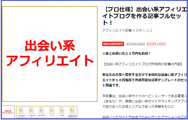 最終案内で「出会い系アフィリエイトブログを作る記事セット/199,000円」のコンテンツを販促していますが属性を絞っていますので、毎月安定して販売することができます。