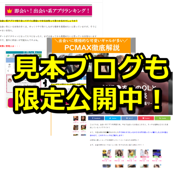 出会い系ブログの作り方が解らない…、という場合に備えて見本サイトを限定公開し、出会い系SEOアフィリエイトブログの作り方を徹底解説しているPDFマニュアル200ページを特典追加いたしました!
