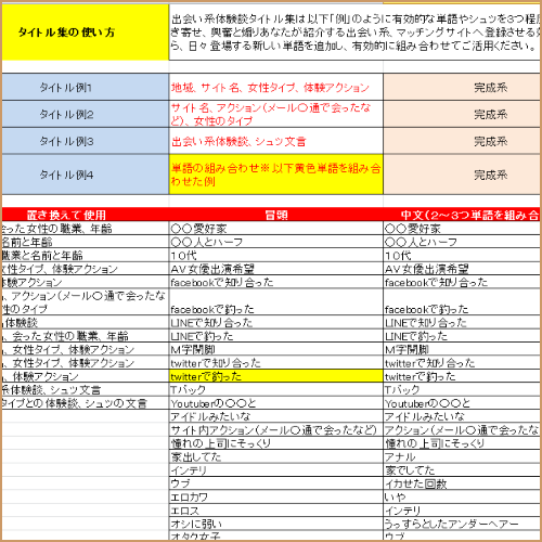 ブログやツイッターで実際にテストし男性ユーザーが食いつく文言集となっていますので、新規ユーザーがアクセスしてくるタイトル文章が思いつかない、自分で作っていると同じような単語が乱立してしまう…というときにはご活用ください。