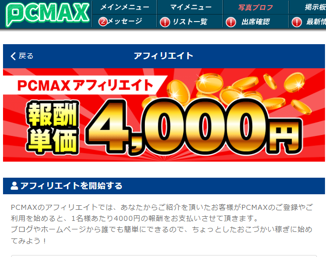 男性向けでも然りで、PCMAXに登録するとアフィリエイト紹介の権利がもらえるので稼げる、という紹介法はNGです。