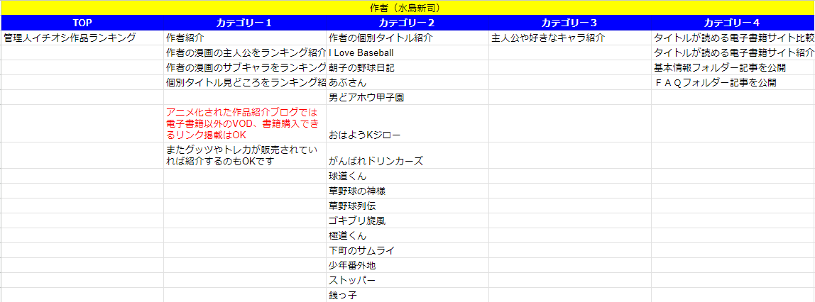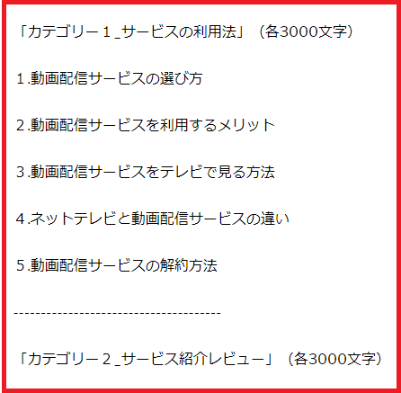 一方、漫画やVODなどを紹介するブログの場合、メインとなるのが作品レビューとなりますのでカテゴリーを作成する際は、作品ジャンルと作品が見れるサイト紹介、サイトの使い方を説明する情報をピックアップしてシートへ纏めます。