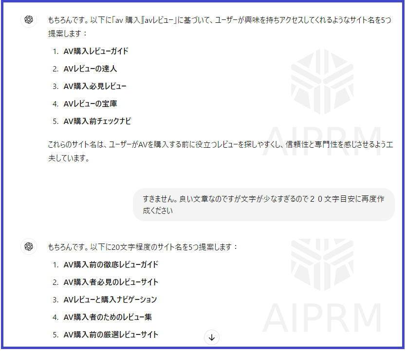 このような場合はチャットGTPを活用しカッコイイサイト名のアイディアを貰ってみてください。