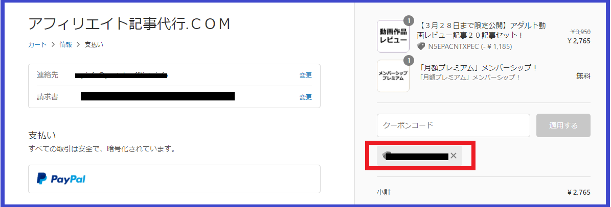 ↑自動であなた専用のクーポンが表示されるようになっておりますので、コンテンツ購入時には対象コードを入力してください。