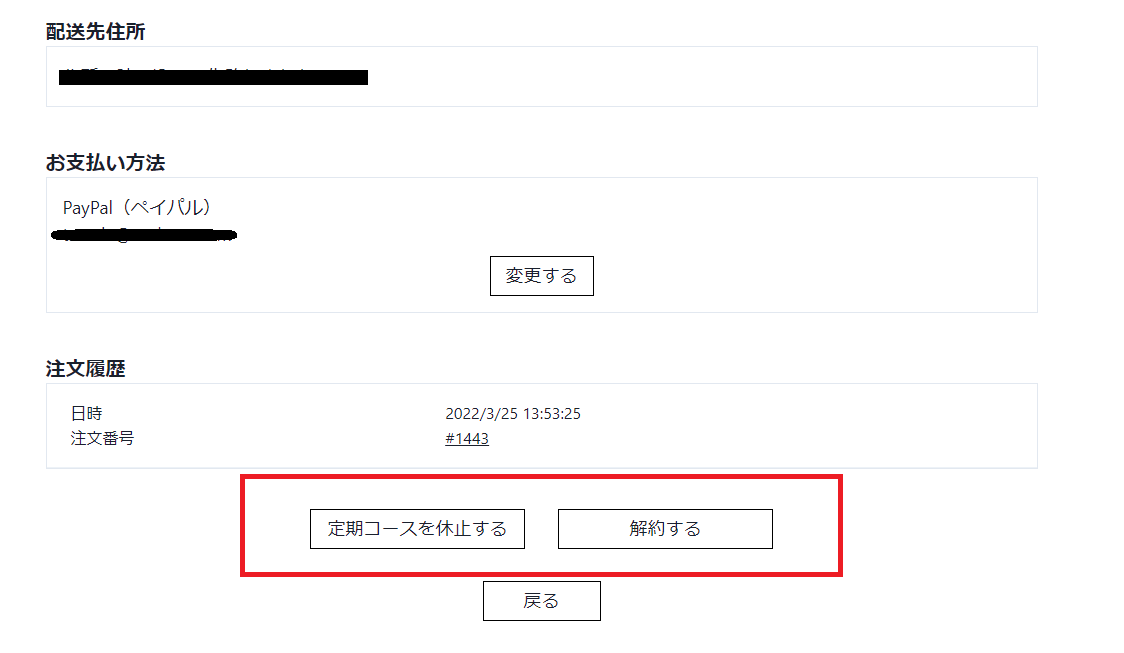 上記の囲みにあります「定期コースを休止する」「解除する」ボタンより停止、解除ができます。